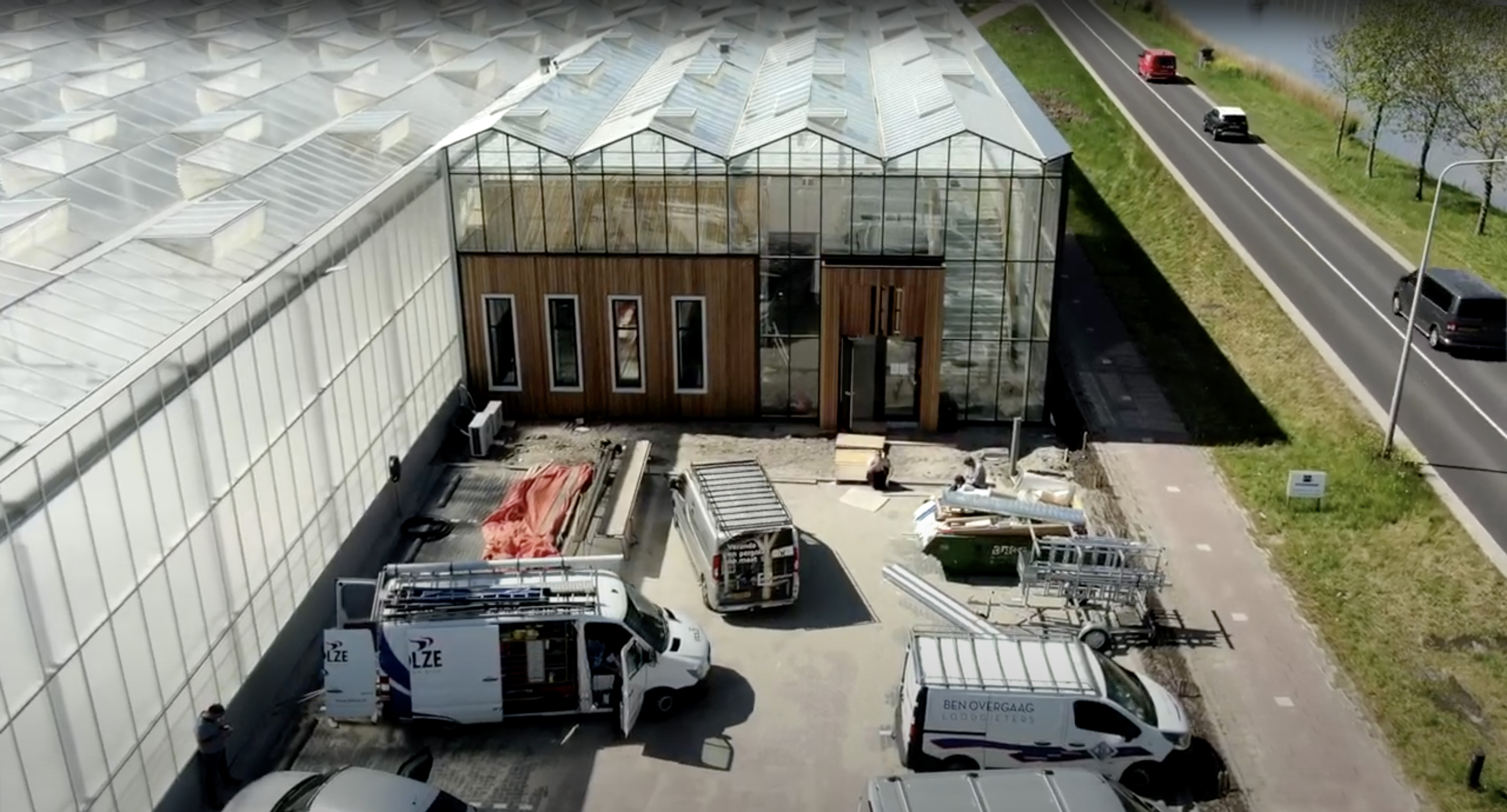 Vanuit de lucht is te zien dat aan de rechterkant de productiekas is gerealiseerd en links het ontvangstcentrum en het democentrum.