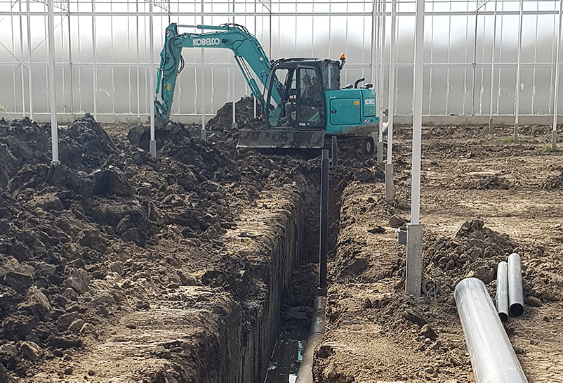 Op het perceel komt nu één lange kas met een pad in het midden. “Naast de moderne venlokas realiseren wij ook de cv-installatie met hijsverwarming en de luchtbehandelingsinstallatie met in totaal 35 luchtbehandelingskasten. Het is een klimaatsysteem zoals wij dat al eerder voor chrysantentelers mochten realiseren, onder meer ook op een ander bedrijf van Van Uffelen Flowers”, zegt Hartman.
