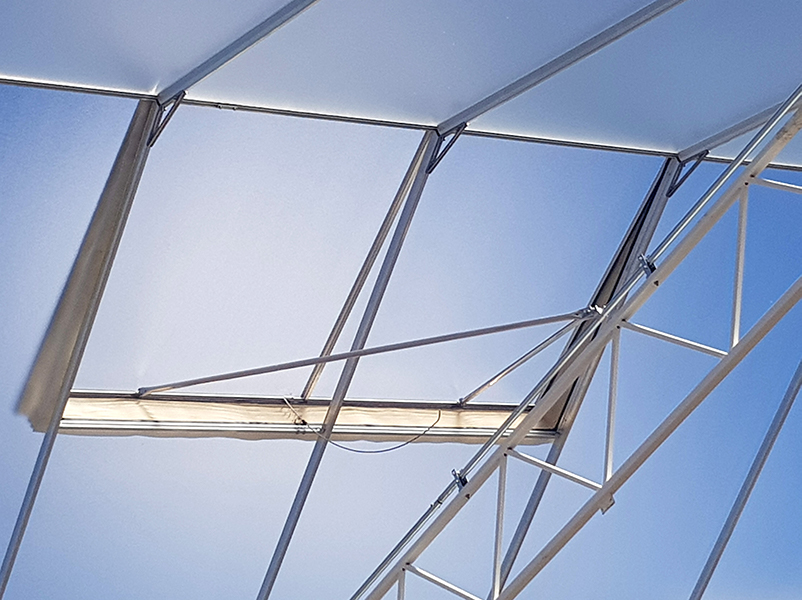 Bij de uitwerking van het deksysteem hebben Technokas en BOAL Systems gekozen voor een brede basis die veel aanpassingen en mogelijkheden biedt om de kas te specificeren voor teeltoptimalisatie. “Op diverse punten in het dek en de gevels houden we rekening met de grote oppervlakte van het project. Dit stelt specifieke eisen aan belastingen, materiaalkeuze en bevestiging. Samen met Technokas hebben we extra nagedacht over en rekening gehouden met op maat gemaakte oplossingen voor de teler en zijn teelt. Voorbeelden hiervan zijn de kap- en vakmaten, luchtraamconfiguratie, condenswaterafvoer en dilatatiewerking”, zegt Van der Ven.