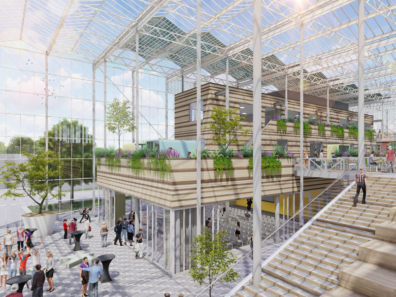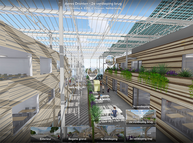 Een kasconstructie als overkapping zorgt voor lagere exploitatiekosten en een gezond binnenklimaat door onder meer natuurlijke ventilatie en veel daglicht. Om oververhitting in de zomer te voorkomen installeert Technokas een scherminstallatie. In combinatie met een slim energieconcept levert de bouwvorm een belangrijke energiebesparing op. In aanvulling op deze constructie kiest de architect voor hout in de afwerking van wanden en trappen. Loopbruggen verbinden de twee gebouwen. De onderwijsruimten monden uit op groene dakterrassen. Zo ontstaat dé ideale plek waar studenten kunnen samenkomen.